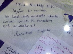 Şimdi de “GIDA & TEKEL” görselinin altındaki fotoğrafa bakalım. “İTÜ Kurtköy E10 tayfası” Kadıköy’deki Adapazarı Islama Köftecisi’nde çorba içmişler. Afiyet olsun! Ne yazık ki hâlâ -de bağlacının kullanımını öğrenememişler bizim İTÜ Kurtköy E10 taifesi! “Ya hocam, alt tarafı bir köftecinin masa altına not yazıyoruz, ona mı dikkat ediceez yani?” müdafaasını buna benzer cümlelerle yapacaklardır arkadaşlarımız muhtemelen. Oysa Türkçe yazarken (nerede olursak olalım, hangi iletişim aracını kullanırsak kullanalım) olabildiğince hassas, titiz ve dikkatli olmamız icap eder. “Cnm, nber, ok, muck, tşk” gibi “tasarruflu” bir iletişim dili almış başını gitmişken benimki “ükela moruk” muhabbeti gibi algılanıyor. Her şeye rağmen, meraklısı için -de bağlacının kullanım alanını nakledeyim: “Başlıca görevi, birlikte kullanıldığı sözcüğün kavramını daha öncekine katmak olan de bağlacı, kendinden önceki sözcükten ayrı yazılır; ünlüsü, kendinden önceki sözcüğün ünlüsüne kalınlık-incelik yönünden uyar; ancak, bağlacın başındaki ünsüz değişmez: Ben de görüyorum. Ondan da isterim. Defter de gerek, kitap da… De bağlacı, adların durumunu bildiren -de ekiyle karıştırılmamalıdır. De bağlacı, bir sözcük olduğıu için ayrı yazılır; ek olan de ise bitişik yazılır ve bitiştiği sözcüğe ünsüz ve ünlü bakımlarından uyar: ev-de, yol-da, beşik-te, sokak-ta…”