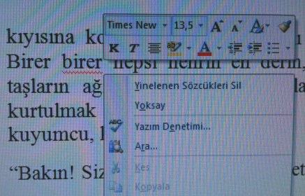Geçen hafta sonu bir Peştun masalını düzeltiyordum. O da ne! Microsoft Word hazretleri “birer birer”lerin altına dalgalı çizgiler çekmekte! “Yinelenen Sözcükleri Sil” imiş! Kim yaptıysa bu ayarı! Tepem attı! Senin micro’na da soft’una da başlarım deyip asabımı bozan bu düdük makarnasının angut angut, saç baş yolduran, abuk sabuk ikazlarına bastım küfrü!