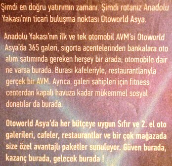 “Bir çok” ise en masumu! “Body”ye hem “cafeleriyle” hem “kafeleriyle” yazanların kafalarını nasıl tütsüledikleri de ayrı bir muamma. Bu arada, “kaptan”ımız Ahmet Özhan mı? Peki ya, “OtoWorld” mü, “Otoworld” mü yazacağına karar verememek? Bunu bile standarda bağlayamadıktan sonra o dümeni nereye kırarsan kır be kaptan!