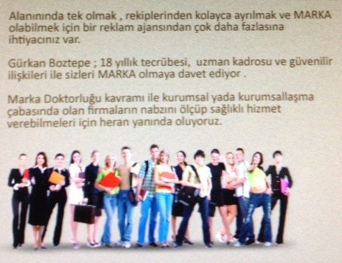 Marketing Türkiye’de de tam sayfa ilanını gördüm “Marka Doktoru”nun. Söz konusu ilanda ana görsel bir steteskop idi. Kalp şekli de verilmiş. (Bkz. “Ayrıl da gel!”, 15 Kasım 2012) “Art”istik atraksiyonlar had safhada yani. Bir de “MARKA”nın “R”sini daire içine almışlar. Bilirsiniz, “esinlenme” illeti denen bir hastalık var. Allah esirgeye! Ancak şu aşamada yapacak bir şey yok. Ümitsiz bir vak’a. Doktorumuzun web sitesine göz gezdirmekten de alamadım kendimi. Alttaki fotoğrafa bakınca “Marka Doktoru”muzun yoğun bakımda can çekiştiğini göreceksiniz. Türkçeyi pervasızca ezip geçen, katleden, yazdığını okumayan “uzman kadro”nun ve “Marka Doktoru”nun Allah taksiratını affetsin.