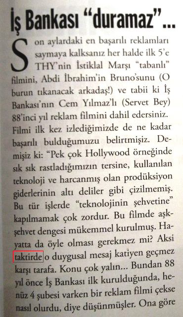Nedîm’in (1681-1730) ruhu şâd olsun. “Sızmak, damlamak”tan Arapça “katr” ve “damıtma, imbikten geçirme” anlamı taşıyan “taktîr” ile “hal ve koşul” bildiren “takdirde”yi şaşmaz bir azimle karıştıranlardan biri de Marketing Türkiye’nin (15 Ekim 2012) yazarı Ali Saydam. Ali Bey’e gelene kadar o kadar çok ünlü yazar, akademisyen ve reklamcı var ki.. (Hıncal Uluç noktalamasının vazgeçilmez aksesuarıdır “..”, bir kullanayım dedim.) O da sanırım bu “taktirde” furyasından etkilenmiş olmalı.