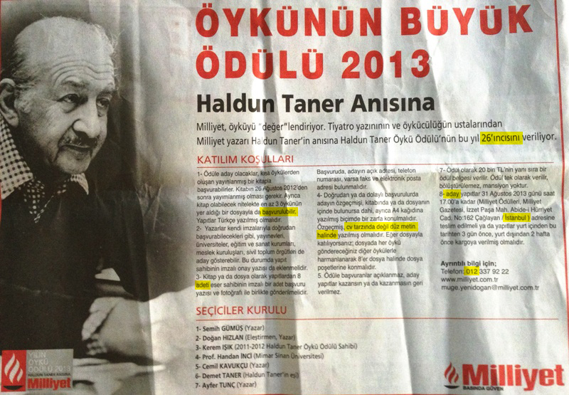 Ben “Seçiciler Kurulu”nda yer alacağım ve Haldun Taner gibi büyük bir edebiyatçının anısına öykü yarışması düzenlenecek, bu yarışmanın da duyurusu ilgili gazetede yayınlanmadan evvel, bakalım ne yazmışlar diye okumayacağım öyle mi? Maalesef “seçici”lerden bir kişi bile bu duyuruyu okumamış. Görünen bu. Hazin olduğu kadar utanç verici.