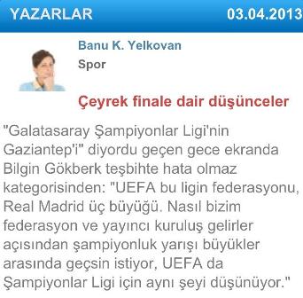 (…) “yıkanıp yıkanamayacağını görmek istiyor.” yazsa kıyamet mi kopardı acep? “Teşbihte hata olmaz kategorisinden” nece? Banu Hanım, size bir sır vereyim mi? Türkçede böyle bir kullanım yok. Ona “teşbihte hata olmaz kabilinden” derler. Siz de Türkçeyi daha derinlemesine, enine boyuna deneyimlemek isterseniz, spor basının usta kalemi İslam Çupi’yi okuyun lütfen.