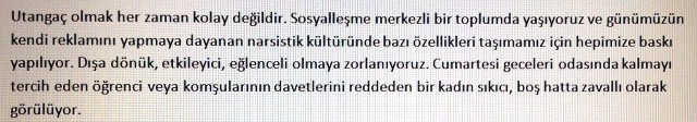 [G]ünümüzün kendi reklamını yapmaya dayanan narsistik kültüründe bazı özellikleri taşımamız için hepimize baskı yapılıyor. Dışa dönük, etkileyici, eğlenceli olmaya zorlanıyoruz.