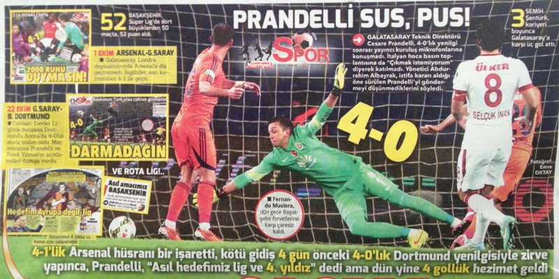 Cümle âleme rezil rüsva olan GS’nin “dört dörtlük” mağlubiyet serisi, spor basınına ve “sosyal medya”nın cin fikirli gençlerine fena halde malzeme oldu. Üstteki fotoğraf Hürriyet gazetesinden. Odaklanacağımız husus, GS’nin taktik ve teknik arızaları falan değil; “PRANDELLİ SUS, PUS!” yazabilenlerin basındaki ürkütücü mevcudiyeti…