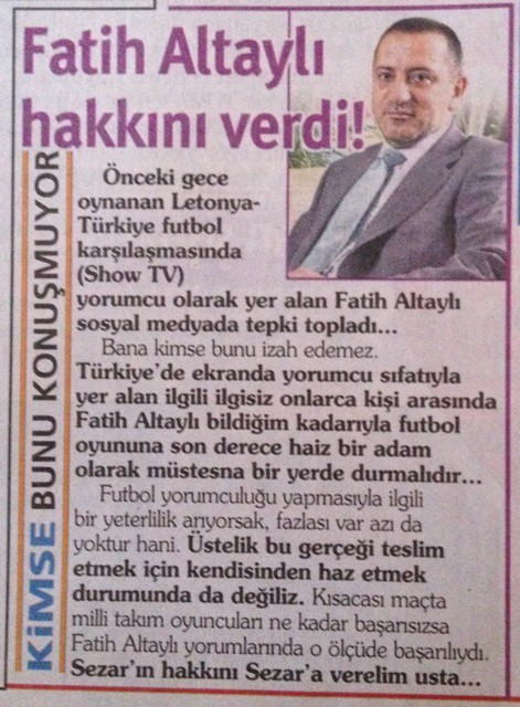 Biraz gecikmeyle de olsa Bu Fatih Altaylı güzellemesinin sahibini yazayım: Mesut Yar. Ah, bi’ de “haiz” kelimesini nasıl kullanacağını bilseydi… “Hazzetmek” yazmayı da bilmiyor, CNN Türk’teki Burada Laf Çok programında espri üstüne espri patlatıp monitörlere el ense çeken Bay Yar. Yetmiyor, Posta gazetesinde de Türkçenin canına okuyor. Nasılsa “yurdumun şairleri” ile penis boyuyla kafasını bozanlar var karşısında… Yar babam yar! Affedersiniz, yaz babam yaz!