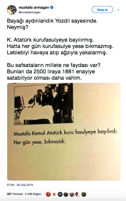M. Armağan’ın üslubu çirkin, bu ayrı bir husus. “Safsata” dedikleri de “safsata” değil, bir liderin ruh dünyasına ışık tutacak bu kabil hoş teferruatları kim merak etmez ki! Kılıç Ali’nin ve Gazi’nin aşçılarının kuru fasulyeyi sevdiğine dair beyanları var ne de olsa. M. Armağan adlı “tarihçi” sıfatlı birinin şehvetle, hiçbir araştırma yapmadan saldırıya geçmesi “taraf” olduğu zihniyet yapısı düşünüldüğünde anlaşılır bir şey, bu da tamam, tamam da… Tamam olmayan o devâsâ şey Yılmaz Özdil’in KAY-NAK-ÇA-SIZ “M. Kemal” kitabı yazma cür’eti, umursamazlığı, ciddiyetsizliği, düşüncesizliği… İşte buna tahammül edemiyorum. Hele hele o acınası yazım yanlışları da bir anıt (!) gibi her baskıda kaya gibi yerinde durmuyor mu hafakanlar basıyor!