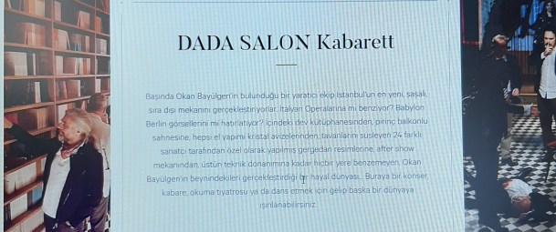 Şehrin “entelektüel abisi” olarak bir mekân açmasını bekliyordum. İyi bir dünyalık yaptı haliyle. Kazandıklarını çarçur etmeyip bir “complex” açmış Şişli’de: Dada Salon. İyi yapmış. “Bar”, “Kabarett”, “Club”, “Brasserie & Sahrap” adlarında kompartımanların olduğu bir “entelektüel mekân” demekte beis yok. Reklamcılar, sinemacılar, televizyoncular, kapaklarında Yeşilçam filmlerinden apartılmış, renkli Adile Naşit, Şener Şen, Münir Özkul figürlerinin bulunduğu tabloid kültür dergilerinin müdavimi gençlerin bazıları için de “statü” sembolü bir uğrak yeri…