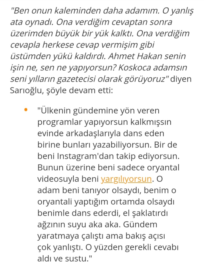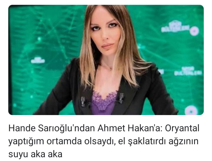 Artık nasıl bir arkadaş ortamıysa… Oryantal oynamaya çalışan arkadaşa ağız suyu akıtan bizden değildir, Ahmet Hakan! Besbelli Hande Sarıoğlu, boş vakitlerinde spikercilik oynamayı seviyordu, o daha ziyade Instagram’daki şuh pozlarıyla hayran kitlesinin ruhuna şifa vermeye ayarlı gibiydi. Kozmetiğin, estetik ilminin sıkı bir takipçisi de oydu. Kulak tırmalayan ses tonuyla “spiker” olarak istihdam edilmesi çok zorken ve diksiyon dezavantajı da gün gibi ortadayken “sarışın kadın” düşkünü “errrkeg” takımının ve “ekşi sözlük” taifesinin “gece avcısı” timine servis edilmiş bir “arzu nesnesi” idi.