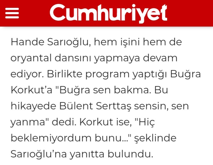 Cumhuriyet gazetesinin başyazısında “yanıtta bulundu” garabeti nasıl ki yer alamazsa web sitesinde de “yanıtta bulundu” kepazeliği yer alamaz, almamalı! Hele hele “hikayede” hiç! Suriyeli gençlere web sitenizde istihdam alanı yarattınız ise ne âlâ! Bu notta amatör oryantal-spiker Hande kızımız “Bülent Serttaş”tır.
